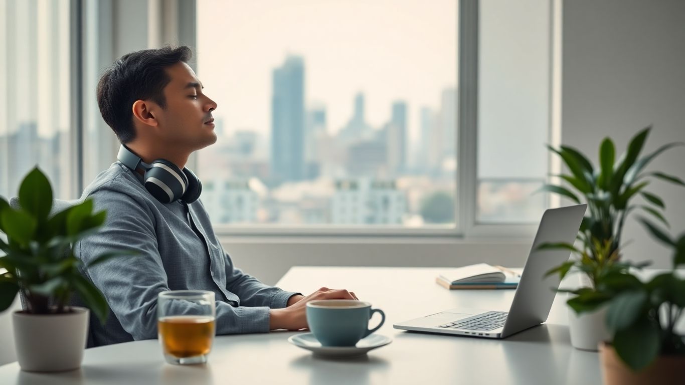 Calm office worker meditating at tidy desk with plants, window.